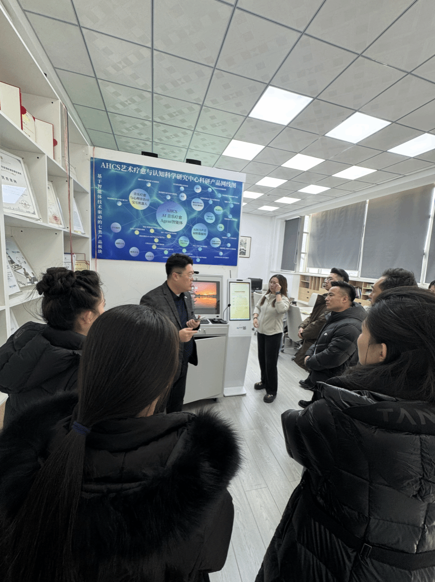 艺术疗愈与认知科学研究中心。由研究中心主任许秋健教授为代表团详细介绍并演示了中心自主研发的“AHCS人工智能音乐疗愈诊治机器人”及“AHCS境愈声态构建系统”,前者融合情感识别与多模态交互,实现从情绪识别到音乐疏导的全流程智能疗愈;后者是国内首套“声—光—情”一体化智能环境干预系统,具备场景自适应与情绪感知功能。两项成果体现了人工智能与艺术疗愈的深度融合,已在医院、学校等多场景中得到应用。