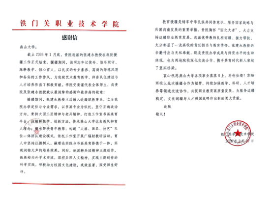 发来感谢信,向我校及张建永教授致以诚挚感谢与崇高敬意,高度肯定其援疆贡献。