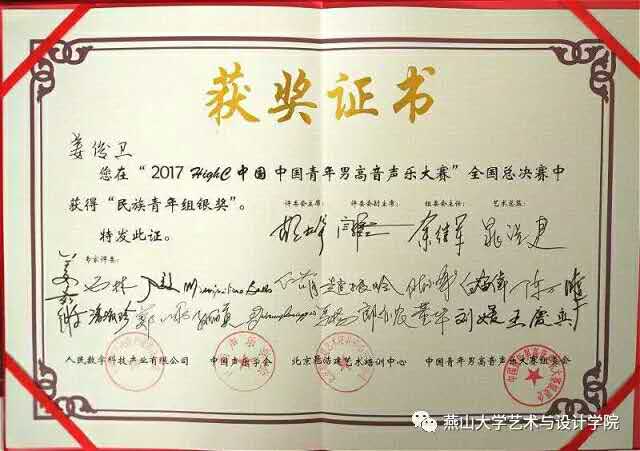 硕士生导师李宗堂教授,在研究生期间专业成绩突出,在2017 “High C中国”青年男女高音声乐大赛河北赛区中,一鸣惊人,取得了河北赛区特等奖的好成绩,直接入围全国总决赛。