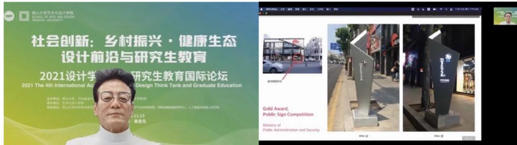 13日下午,会议直播了李振久教授的《通过设计改变城市》和高桥聪教授的《我们挑战在日本创造新的公共空间》两场精彩的学术讲座。两名学者先后发言阐述学术观点,李振久从乡村振兴、文旅融合角度聚焦城市服务、健康生态设计理念,他还将他的设计理念“通过民间故事中的造型美和幽默表达的韩国本土设计”应用到设计作品中,并分享了丰富的研究成果和实践经验。讲座韩语翻译由我校杰出校友视觉传达设计专业杨洋博士担任。