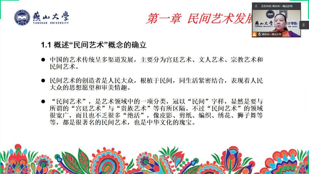 首先,杨志宏以《民间艺术探析》课程为例分享了“课程思政”的先进经验,生动展示了如何通过中国传统文化艺术内容的讲授、艺术技艺的演绎与学生实践的亲历丰富课程环节,并引导学生在完成审美教育与素质教育的同时坚定民族自信与文化自信。