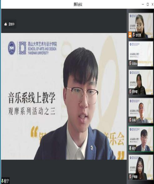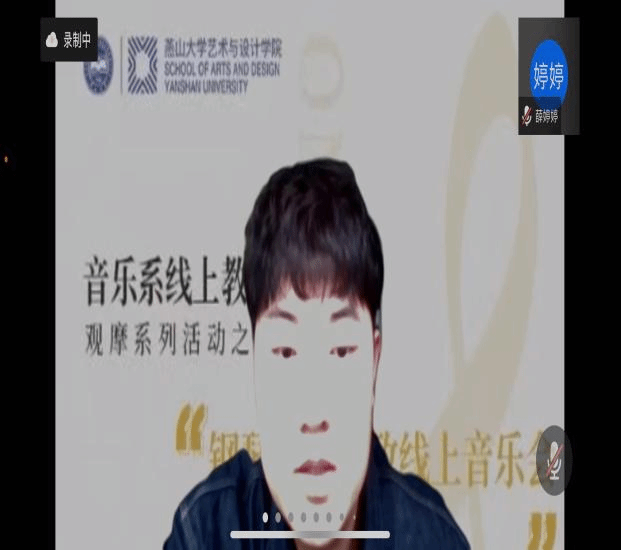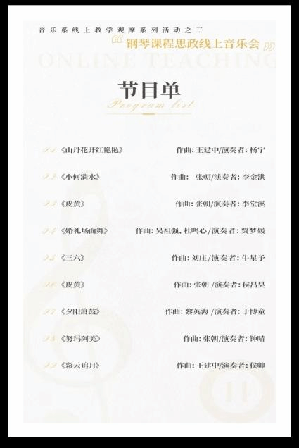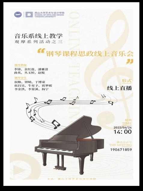 音乐系策划,举办了线上教学观摩系列活动《燕山大学钢琴课程思政线上音乐会》。音乐会的钢琴指导教师有李锋、金红莲、潘雅清、孙英、丛玉婷、赵悦,参加音乐会的学生有侯帅、钟晴、于博童、侯昌昊、牛星予、贾梦媛、李金洪、李棠溪和杨宁。