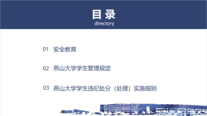 安排辅导员徐原、冯丹红、盖鸿章、旺龙等为同学们领学了《燕山大学学生管理规定》《燕山大学学生违纪处分(处理)实施细则》《百家乐游戏下载