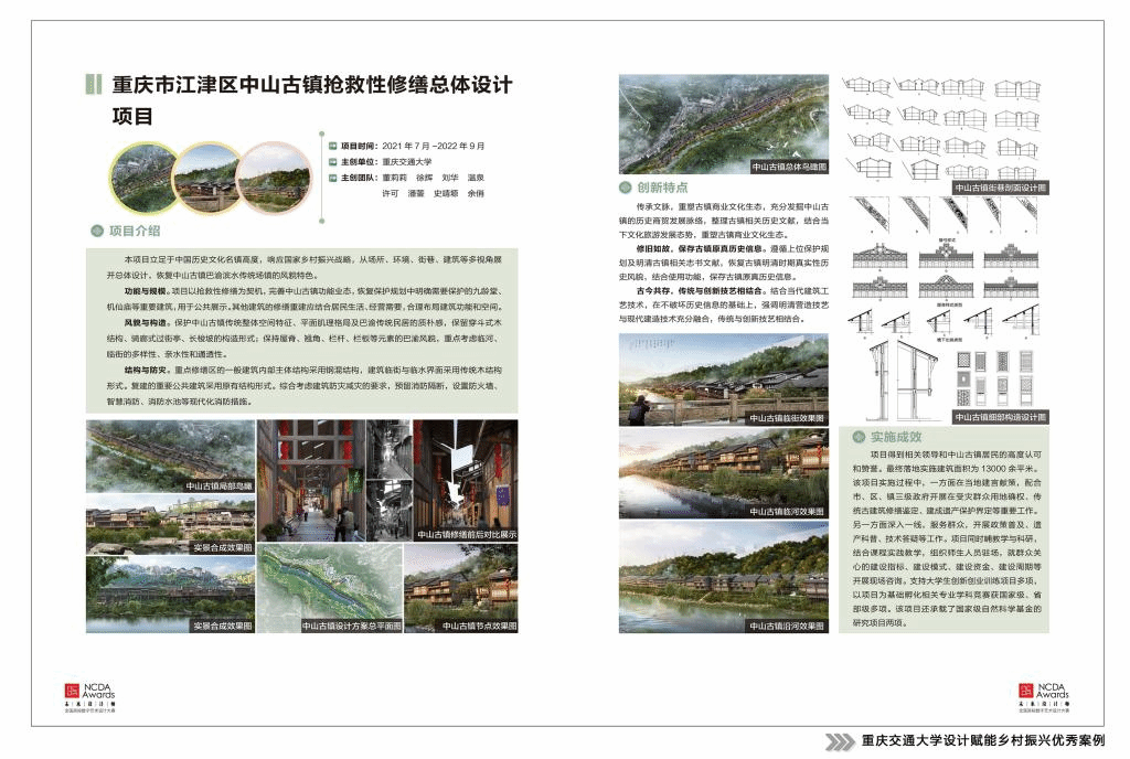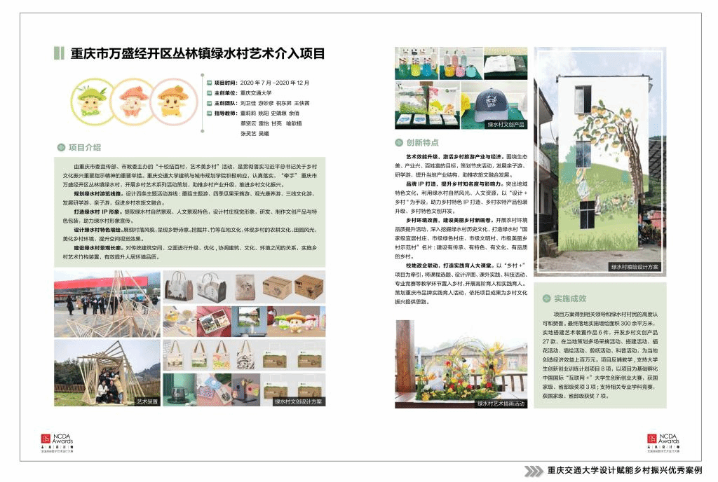 的多个教师团队近几年已走出设计赋能乡村振兴的特色之路,如董莉莉院长团队和姚阳老师团队分别对重庆市江津区中山古镇进行了抢救性修缮规划设计,对重庆市万盛经开区丛林镇绿水村开展了乡村艺术系列活动策划等。经主办方和专家评审,从中精选140个案例汇编成册,由上海交通大学出版社正式出版《设计的力量——全国高校设计赋能乡村振兴创新案例》一书,向社会各界展示高校设计教学创新与大学师生以创意助力乡村振兴的成果。