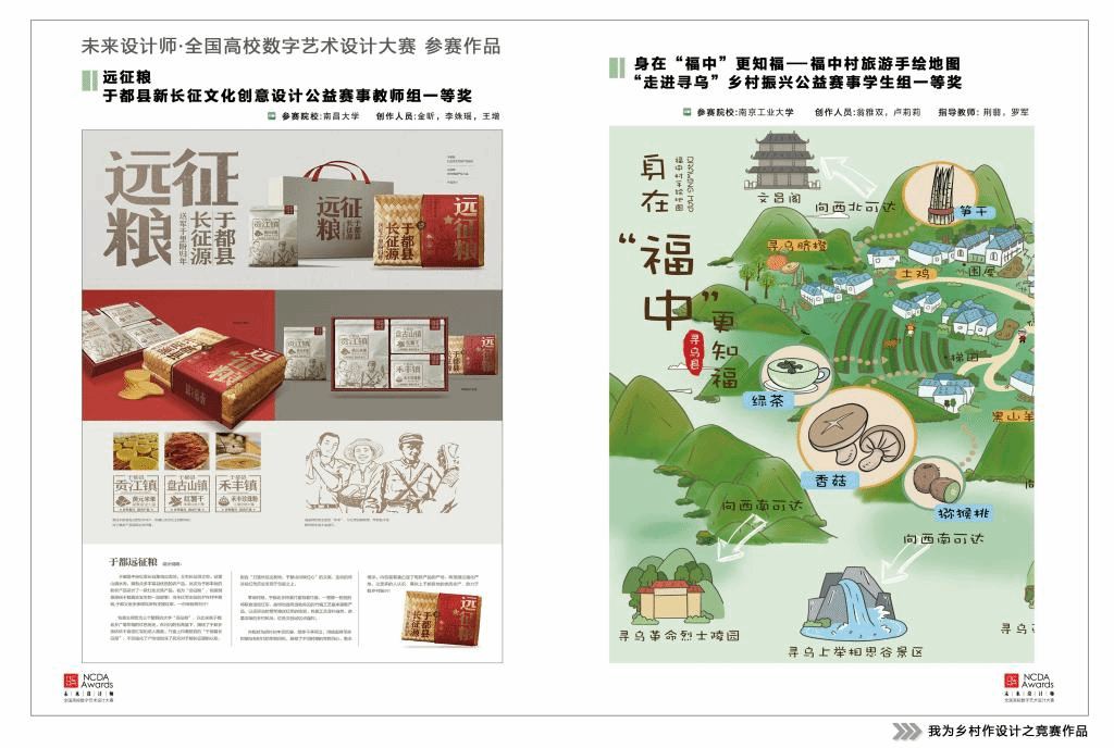 未来设计师·全国高校数字艺术设计大赛(NCDA)由工信部人才交流中心主办,教育部中国高等教育学会认可,已连续举办十届,是具有广泛影响力的国家级大学生设计学科竞赛。大赛秉承“设计为人民服务,培养未来设计师”的理念,近年来坚持设立“乡村振兴”赛项,鼓励高校师生开展设计助力乡村振兴创新实践,引导大学师生积极投身乡村振兴志愿服务,先后为中共嘉兴市委宣传部,中央红军长征出发集结地江西省于都县,革命老区江西省寻乌县,江西省全南县,江西省吉安市青原区,陕西铜川耀州区,内蒙古科右中旗等单位举办了乡村振兴系列活动。
