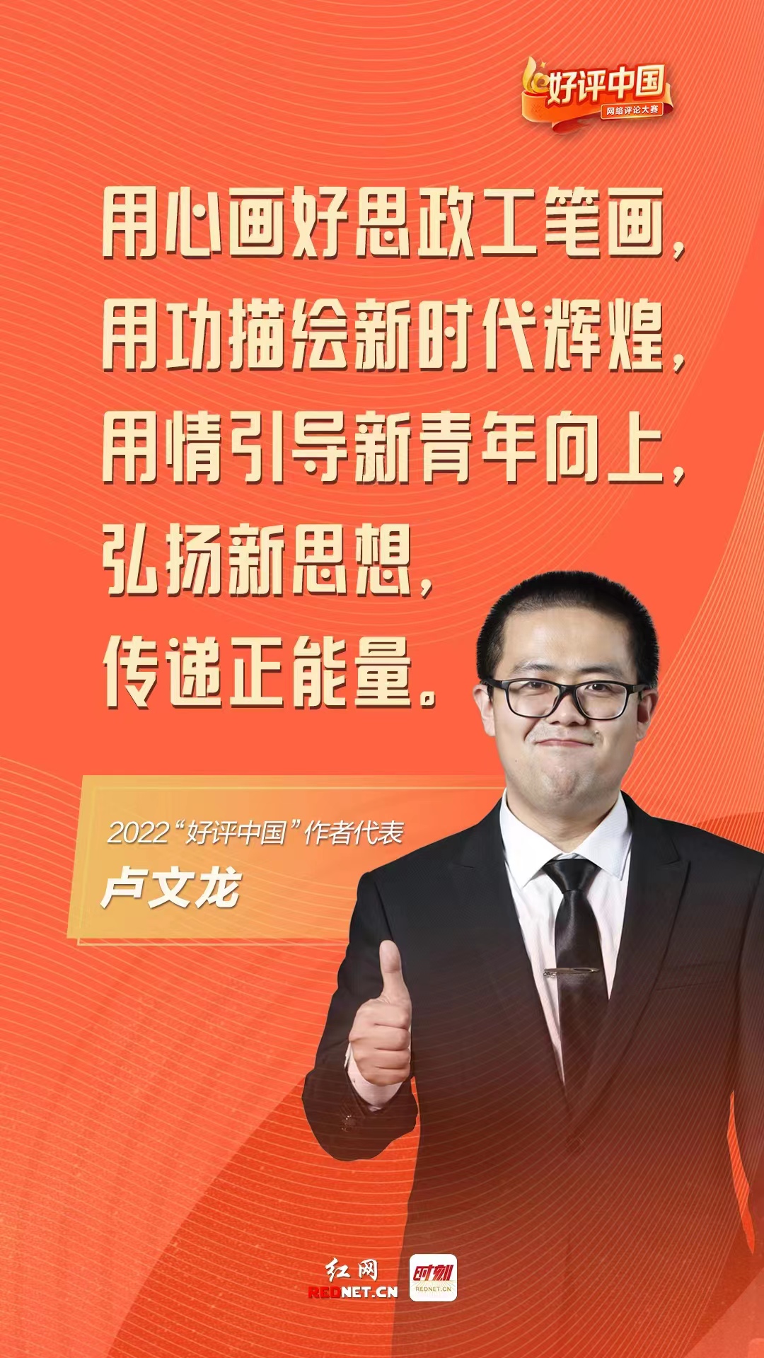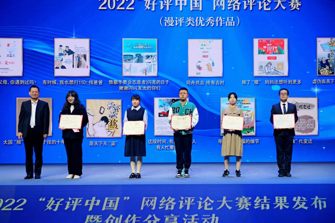 2022“好评中国”网络评论大赛是中国网络评论界的一件大事,也是引领中国网络评论工作未来朝向的一个标志性事件。活动自2022年4月28日正式启动以来,受到社会各界普遍欢迎。大赛共吸引了54088位参赛者、参赛作品49222份。经过专家对参赛作品进行资格审查和初评、复评、终评,最终评选出优秀作品86件,其中优秀文字评论作品50件、优秀视频评论作品19件、优秀漫画评论作品17件。卢文龙创作原创手绘思政主题插画《致敬冬奥会志愿者|闪亮的日子谢谢闪闪发光的你们》作为河北省漫画评论类唯一获奖作品,受邀出席颁奖典礼。