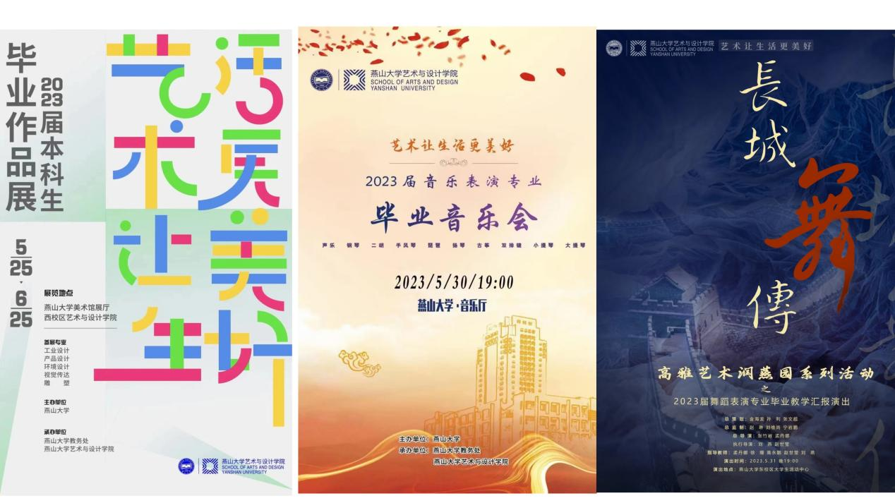 根据自身专业特点,分别精心组织了高水平的毕业展演活动。设计类所属工业设计、产品设计、环境设计、视觉传达设计和雕塑等五个专业314名毕业生的毕业作品于5月25日在燕山大学美术馆隆重展出;音乐表演专业71名毕业生于5月30日在燕山大学音乐厅为全校师生呈现了一场高水平的视听盛宴;舞蹈表演31名毕业生于5月31日在燕山大学东区大学生活动中心用一台精彩的毕业作品汇报演出将本届毕业生的学习成果展示推向了高潮。