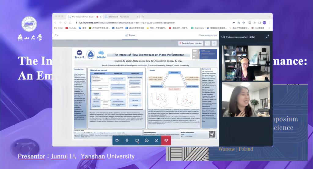 等7所中国高校参加。我校22级音乐与舞蹈学硕士研究生李俊蕊同学(指导教师:许英)进行会议发言,并与Zoé Karlikow(法国索邦大学)、Audrey-Kristel Barbeau(加拿大蒙特利尔魁北克大学)等专家教授围绕通过“心流体验影响钢琴绩效的实证研究”,探索音乐学与心理学、工程学等学科交叉的前沿问题,扎实推进音乐与科学的融合机制研究进行深入交流。