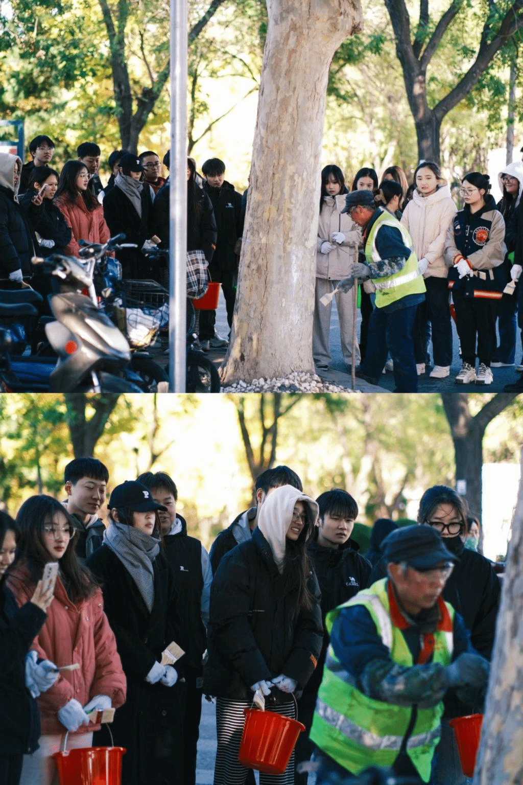 活动现场,后勤服务中心的老师傅们对树林的品类逐一介绍、对相关养护知识详细讲解,认真指导学生们如何操作,每个步骤的注意事项。同学们戴上手套、拿起工具,找到自己的“责任树”,兴致勃勃行动起来。同学们在老师傅们的指导下,不知不觉间,一棵又一棵树木被养护,同学干的热火朝天。一路而下,校园主干路段的树木粉刷一新。当一排排大树粉刷养护后,同学们纷纷转身回望,成就感油然而生。