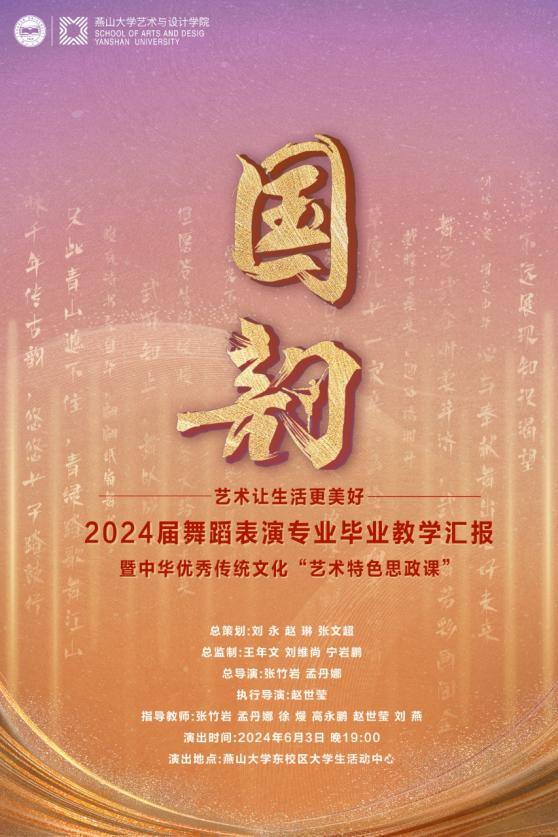 在燕山大学东区大学生活动中心成功举办“中华优秀传统文化”—艺术课程思政教学展示暨2024届舞蹈表演专业毕业教学汇报演出。燕山大学党委常委副校长陈国强,教育部驻青龙满族自治县政府挂职副县长许旭轩,共青团秦皇岛市委书记邱中凯,秦皇岛市政协文史委主任刘敬谦,教育部驻青龙满族自治县委组织部干部谢文,昌黎县副县长刘长春,美国托利多大学副校长萨米·胡安·斯潘、国际学生项目中心主任于心任,百家乐游戏下载
