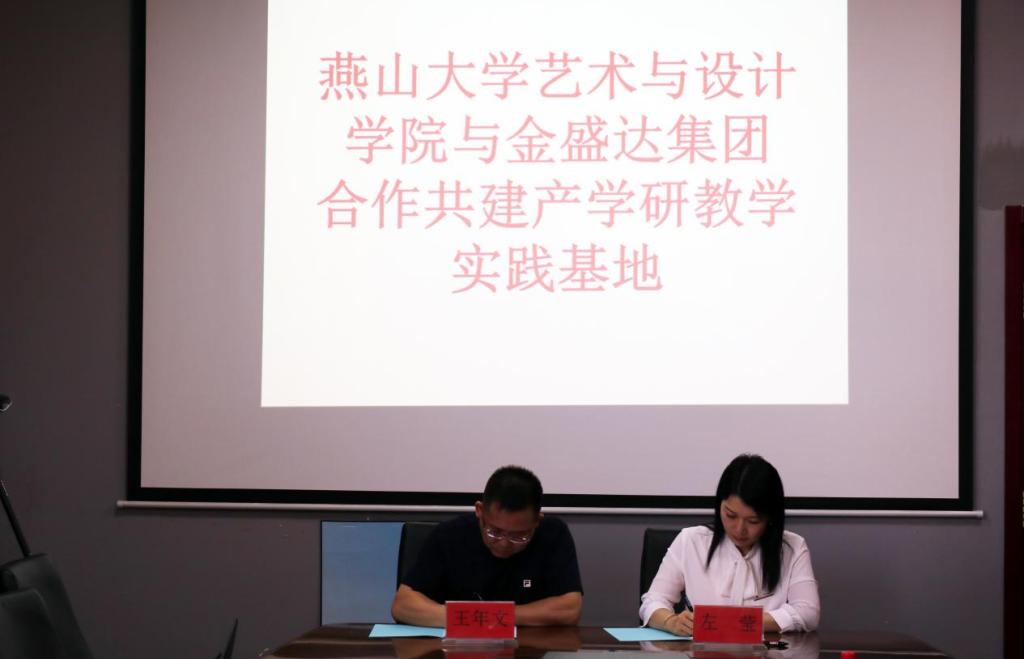 签约仪式上,王年文提出了关于建立与完善“ 燕山大学建筑与装饰设计研究中心”的建议,共同致力于设计+装饰创新发展,在建筑设计、景观设计、艺术装置、空间陈设设计与实践中发挥各自优势。左莹莹详细介绍了秦皇岛金盛达房地产开发有限公司的基本情况,提出共同推进“建筑与装饰”定制项目的创新设计与落地实施,加快创意装饰概念的完善和产品优化,促进开展软装配饰设计理论与实践研究。
