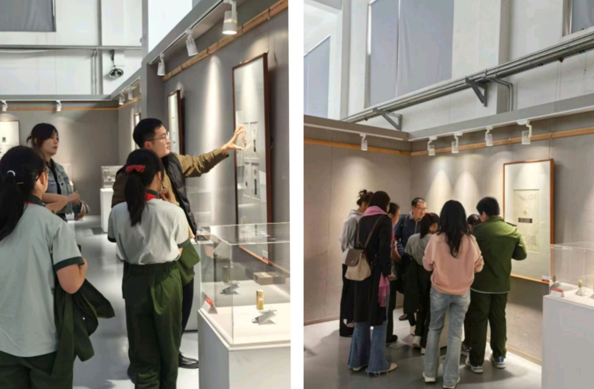 首先,在两位老师的带领下,同学们参观了燕山大学美术馆正在展出的“轩辕锦书”庆祝中华人民共和国成立75周年篆刻展,观展期间,王润泽为同学们讲解了篆刻印章的石材,印屏的制作与欣赏以及展览的陈列方式等等。随后,一行人参观了篆刻基地外墙文化长廊的篆刻发展史资料,并且由王润泽向同学们讲解了篆刻艺术的发展历史、艺术特色以及印章的风格、设计、刀法等。在这期间,同学们还参观了篆刻基地中收藏的当代名家篆刻作品以及古代砖文石刻,学生们积极参与大胆提出问题,兴趣极高。