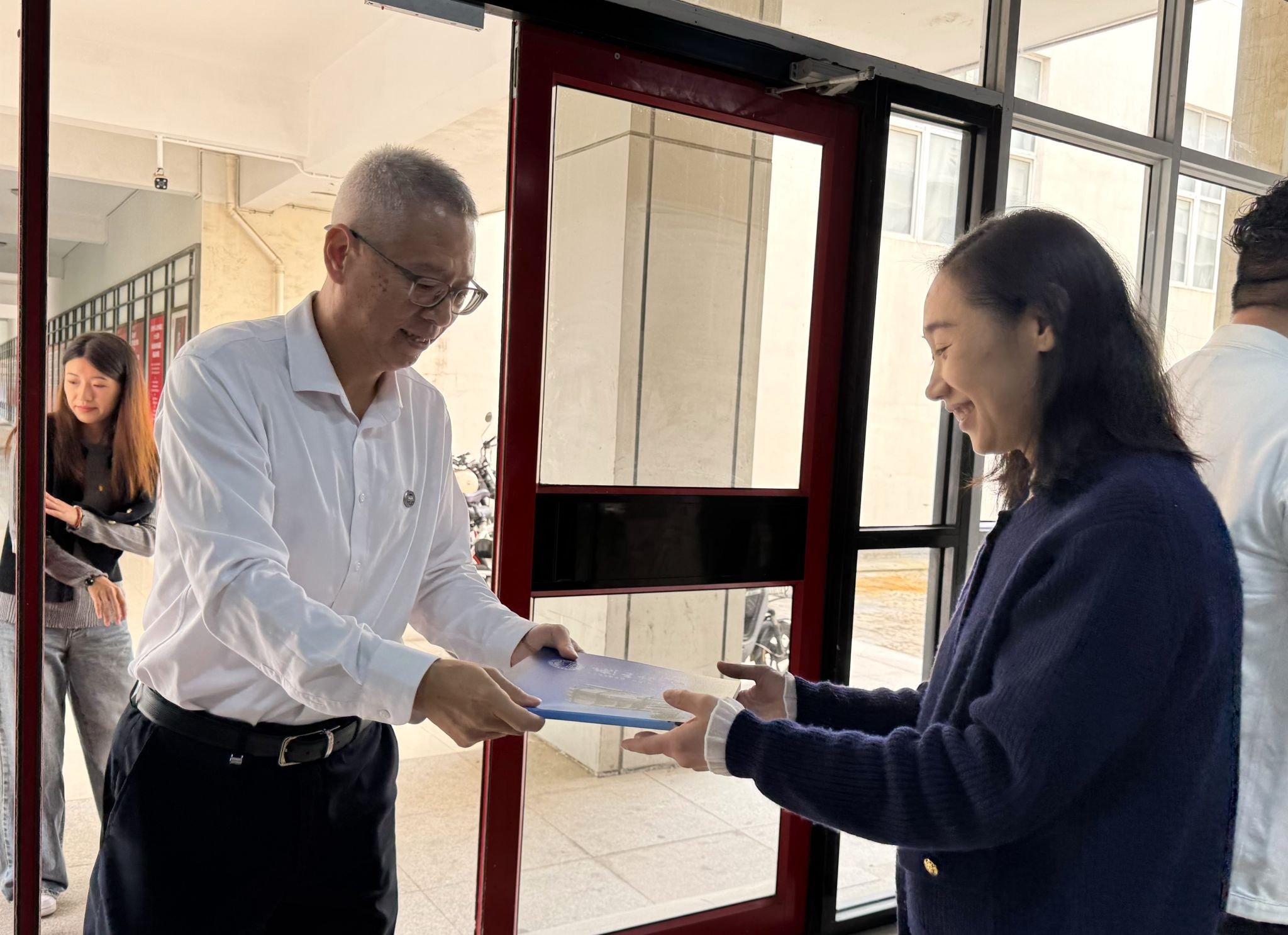 校友办主任张向前代表学校向校友赠送礼物