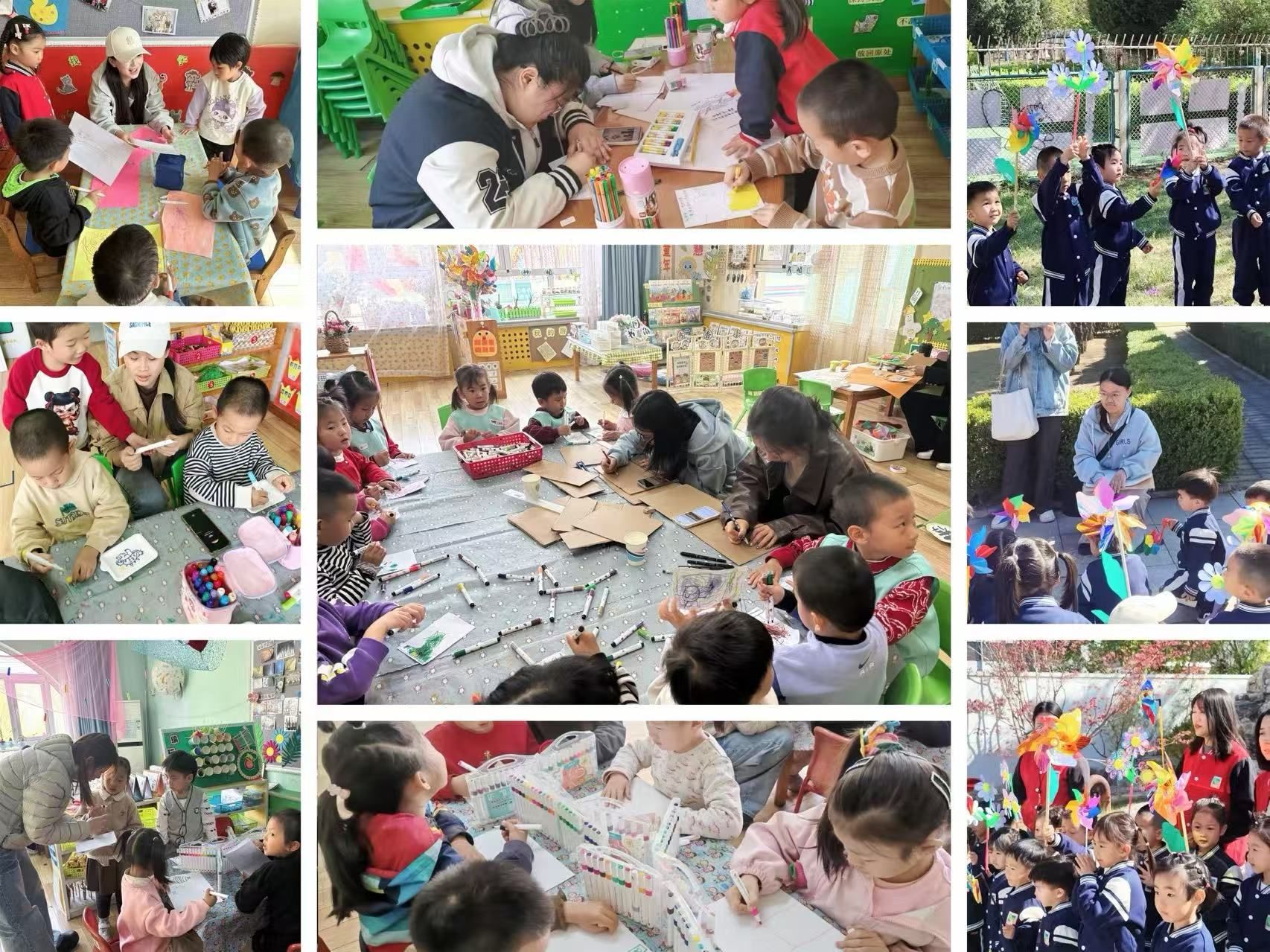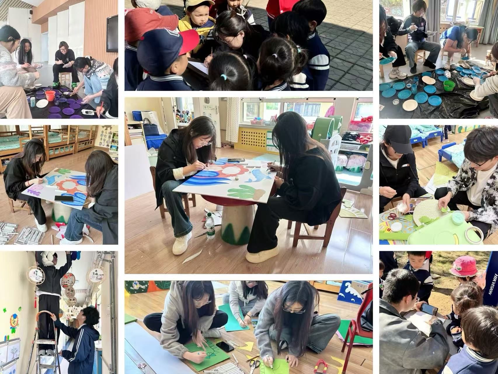 在带领幼儿进行艺术创作之余,同学们积极运用专业优势,投入到幼儿园各班级及园区公共区域的环境创设工作中。他们精心设计、巧妙构思,通过手绘展板、制作主题装饰等方式,为孩子们营造了一个更加温馨、富有创意的学习和生活环境,为幼儿园的世界读书日展览活动提供了丰富的环创作品。此外,同学们还陪伴幼儿校内远足,在远足过程中现场写生,为幼儿营造了温馨愉快的美育氛围。