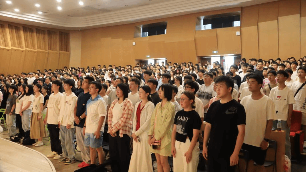 2025级新生开学典礼正式开始,与会领导老师与同学们肃立,齐声高唱《中华人民共和国国歌》。