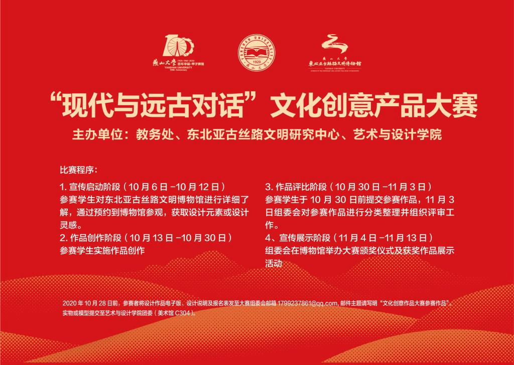 燕山大学东北亚古丝路文明博物馆作为学校重要的文化阵地,开馆以来受到了广大师生的欢迎。为进一步探寻文物与文化创意的对接成果,用人文精神诠释校园文化品位,凝练特色文化品牌,浓厚的校园学创新氛围,提高师生学生的创新实践能力,为百年校庆增添文化气息。学校决定以东北亚古丝路文明博物馆馆藏文物为设计元素,举办 “现代与远古对话” 燕山大学文化创意产品大赛,具体通知如下:
