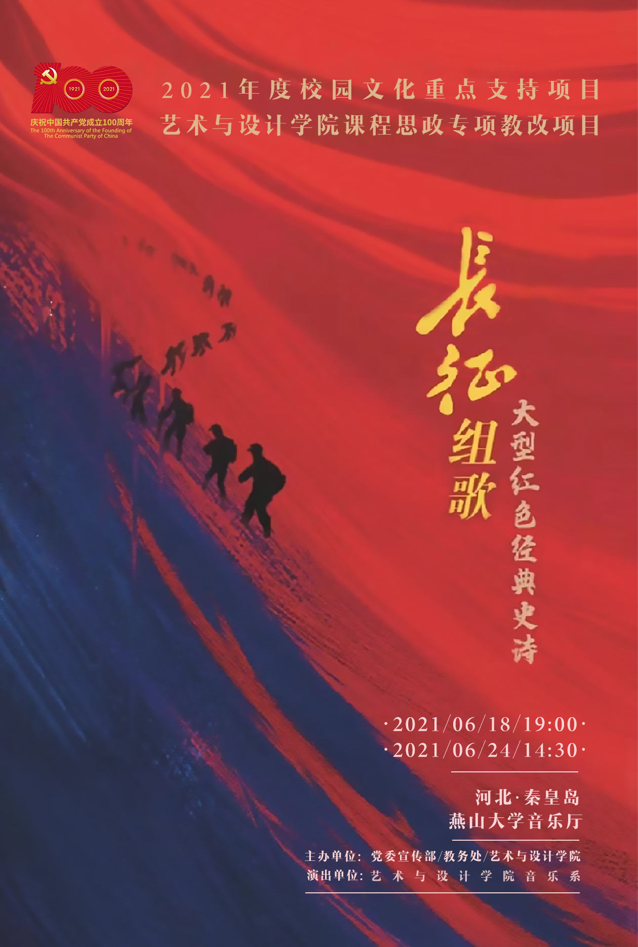 音乐系承办的大型红色经典史诗《长征组歌》将于6月18日(周五)晚19:30和6月24日(周四)下午14:30在燕山大学音乐厅举行。