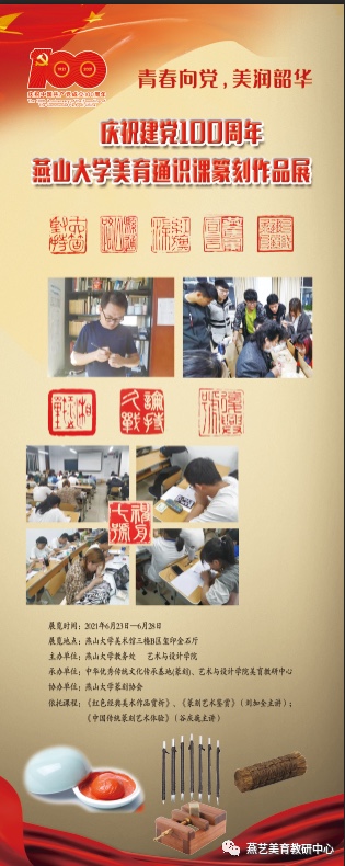 为创新开展高校美育教研活动,以“美育润心,立德树人”为目标,深入践行课程思政教学改革与创新,丰富校园文化生活,向建党一百周年献礼。特举办“青春向党,美润韶华”系列活动——庆祝建党100周年美育通识课篆刻作品展。展览由燕山大学教务处、百家乐游戏下载 共同主办,中华优秀传统文化传承基地(篆刻)和美育教研中心承办。