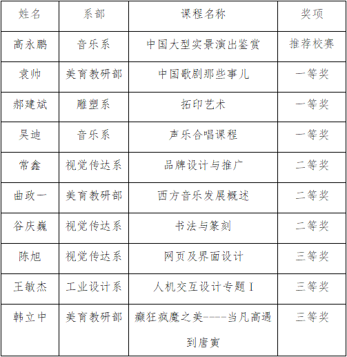为全面推进百家乐游戏下载 课程思政建设工作深入开展,切实促进各类课程与思政课同向同行,百家乐游戏下载 于11月4日下午在美术馆C305会议室举办第四届“艺苑杯”课程思政教学竞赛。经评委现场打分,评选出推荐校赛和一、二、三等奖的教师及课程。比赛结果如下: