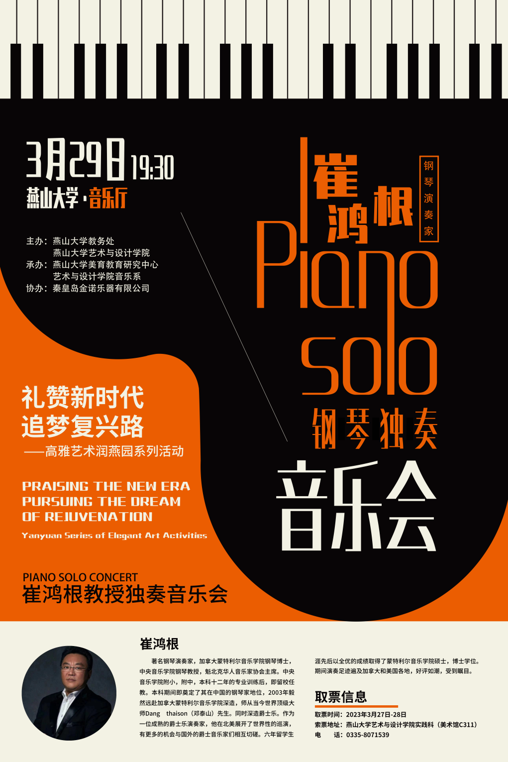 2023年3月29日19:30燕山大学将举办“礼赞新时代,追梦复兴路”高雅艺术润燕园系列活动之崔鸿根钢琴独奏音乐会。