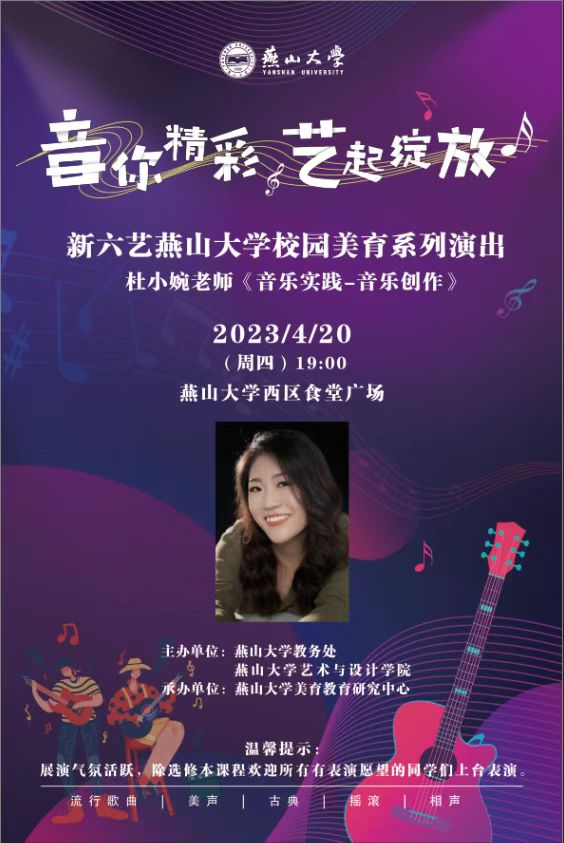 2023年4月20日19:00燕山大学将举办“艺路同行”杜小婉老师课程《音乐实践-音乐创作》结课展演。