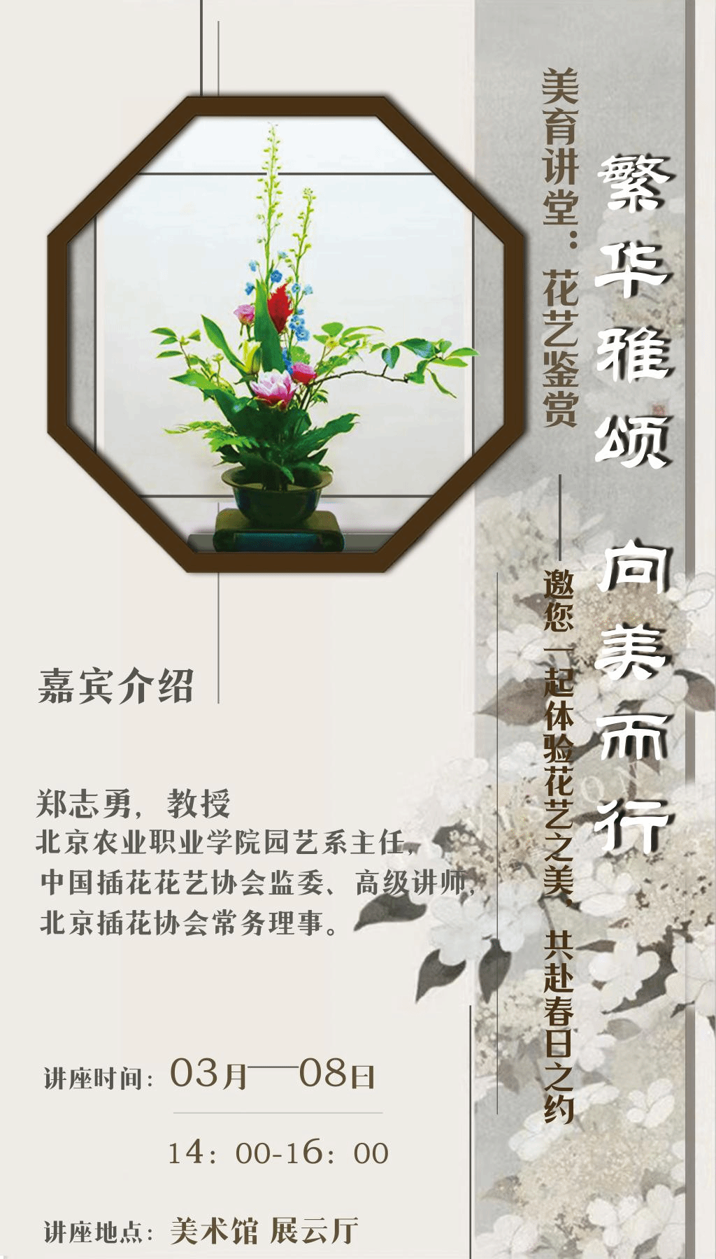 将在第114个国际劳动妇女节来临之时,举办美育系列活动之花艺鉴赏:繁华雅颂,向美而行——邀您一起体验花艺之美,共赴春日之约!