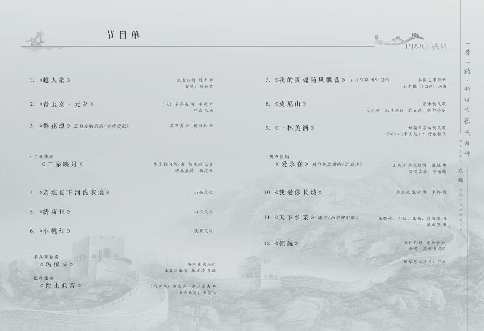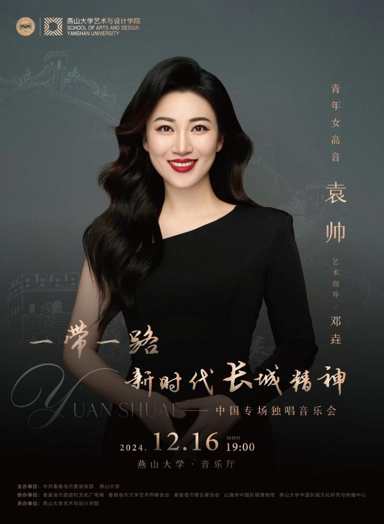 为深入学习贯彻习近平新时代中国特色社会主义思想,积极响应“一带一路”建设高质量发展的号召,充分展现新时代长城精神的深厚底蕴与时代价值,助力长城国家文化公园建设,发挥驻秦高校文化传承与创新职能,特策划举办“一带一路·新时代长城精神——青年女高音袁帅中国专场独唱音乐会”。