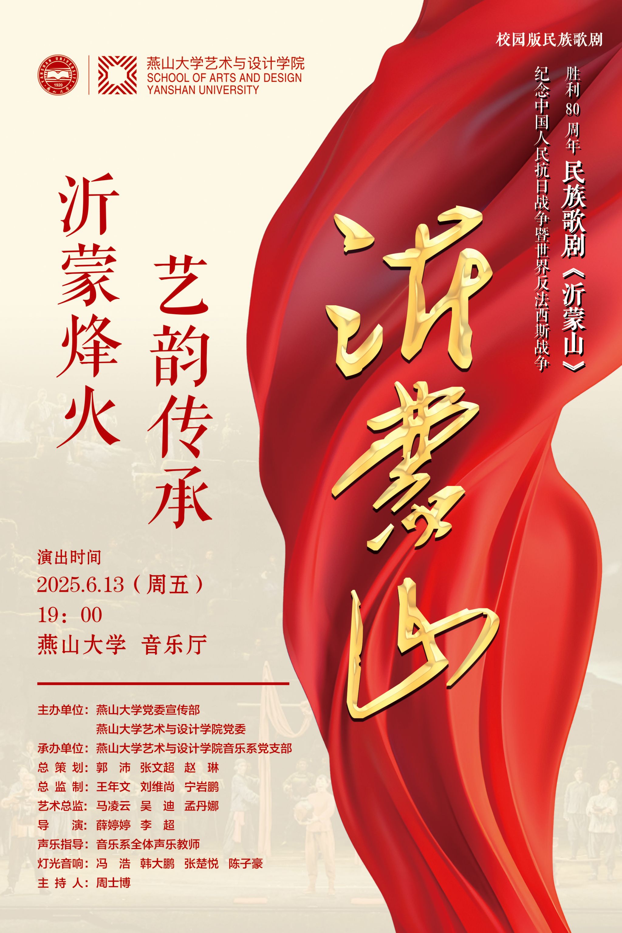 党委主办,音乐系党支部承办,2022级音乐表演专业(声乐专业)全体学生参演的“沂蒙烽火,艺韵传承”燕山大学校园版民族歌剧《沂蒙山》将于6月13日19:00在燕山大学音乐厅首演。此次演出是百家乐游戏下载